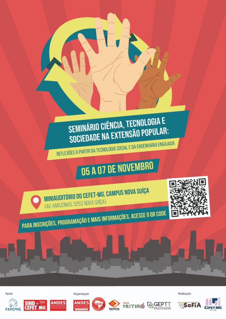 Vem aí o Seminário Ciência, Tecnologia e Sociedade na extensão popular: reflexões a partir da tecnologia social e da engenharia engajada! O evento acontecerá entre os dias 05 e 07 de novembro de 2025, no Miniauditório do CEFET-MG, campus Nova Suíça (Av. Amazonas, 5253, Nova Suíça, Belo Horizonte).